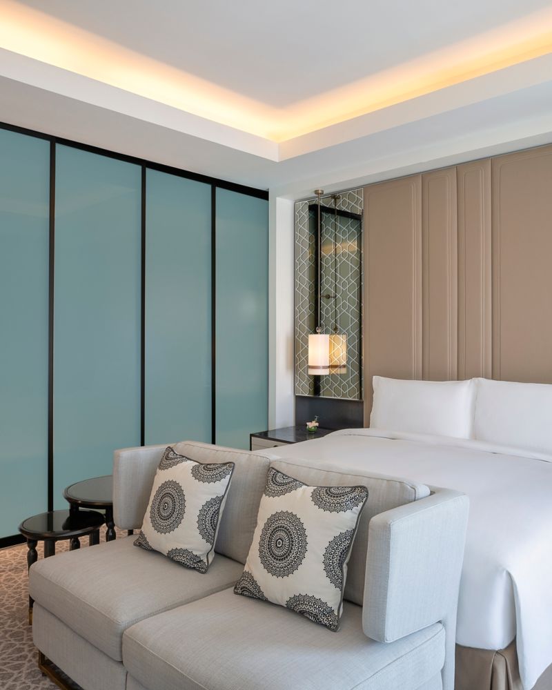 Indulge in 55 sqm of Luxury and Comfort with King Sofitel MY BED with an elegant marble bathroom featuring dual vanity, separate walk-in rain shower and soaking tub. Enjoy luxury amenities, dedicated work desk and coffee machine.