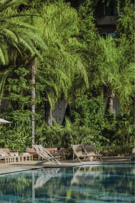 Mergulhe na piscina e a sensação se aprofunda: a água fria envolve você e, enquanto flutua, seus olhos encontram as silhuetas de palmeiras que se erguem ao céu. Ao seu redor, a vegetação exuberante cria um refúgio de vegetação: vibrante, perfumada e viva. O farfalhar das folhas, a fiozinho suave de água e a luz do sol filtrada dançando sobre a superfície evocam a calma de um oásis escondido.