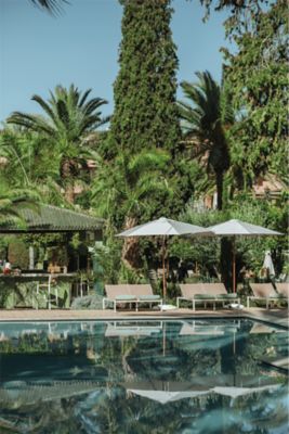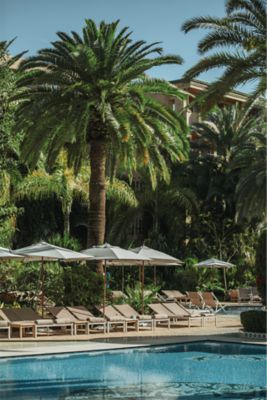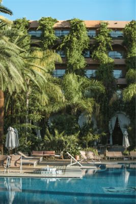 Recoste-se em uma espreguiçadeira à beira da piscina no Sofitel Marrakech, feche os olhos e sinta o calor do sol dissolver lentamente suas tensões. Ao abri-los, seu olhar se eleva para uma copa de folhas verdes ricas e palmeiras altas balançando suavemente na brisa.