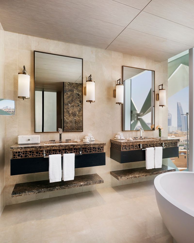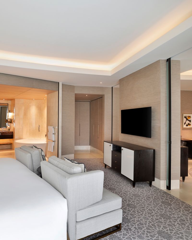 皇家套房可欣赏城市全景,设有 2 间卧室,其中一间配备 1 张特大床,另一间配备 2 张单人床。
