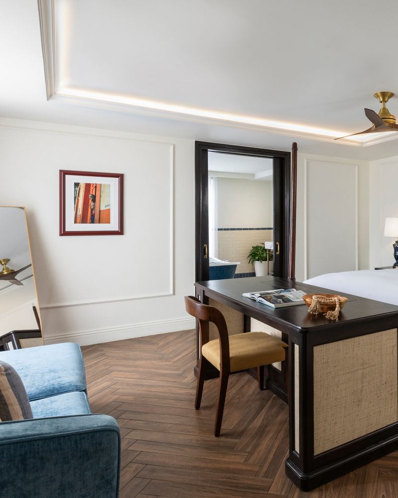 尊享单卧室套房,配备 1 张特大床,面积 85 平方米(915 平方英尺),阳台带会客区,可欣赏广场庭院景观