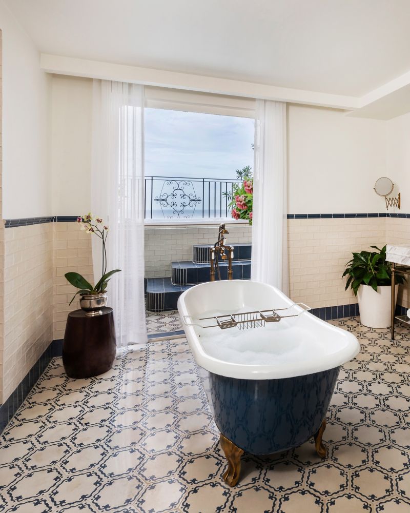 歌剧院单卧室套房,配备 1 张特大床,面积 185 平方米(1991 平方英尺),阳台带按摩浴缸,可欣赏广场庭院景观