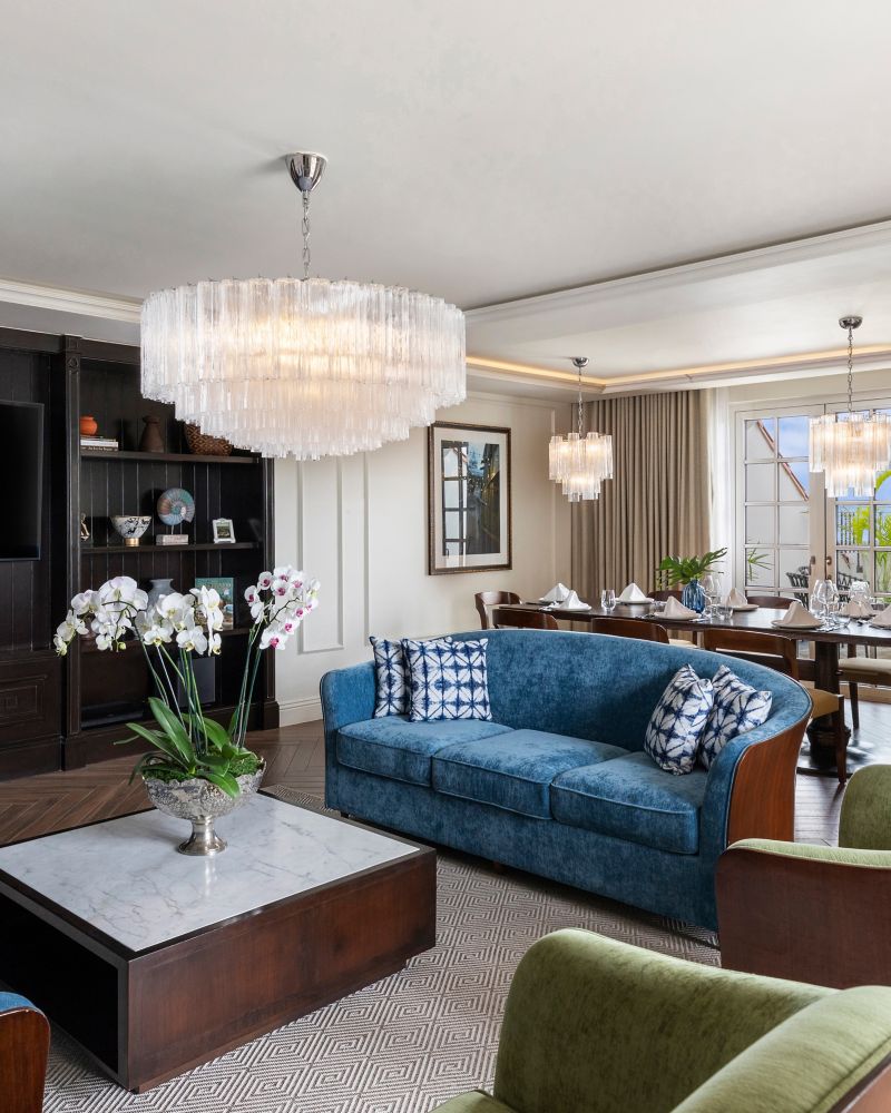海景单卧室尊享套房,配备 1 张特大床,面积 85 平方米(915 平方英尺),L 形阳台带会客区