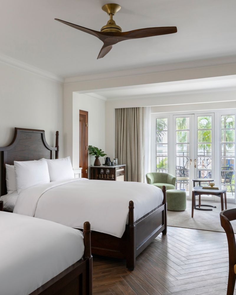 尊尚房,配备 2 张全尺寸床,面积 55 平方米(592 平方英尺),阳台设有起居区,可欣赏广场庭院景观